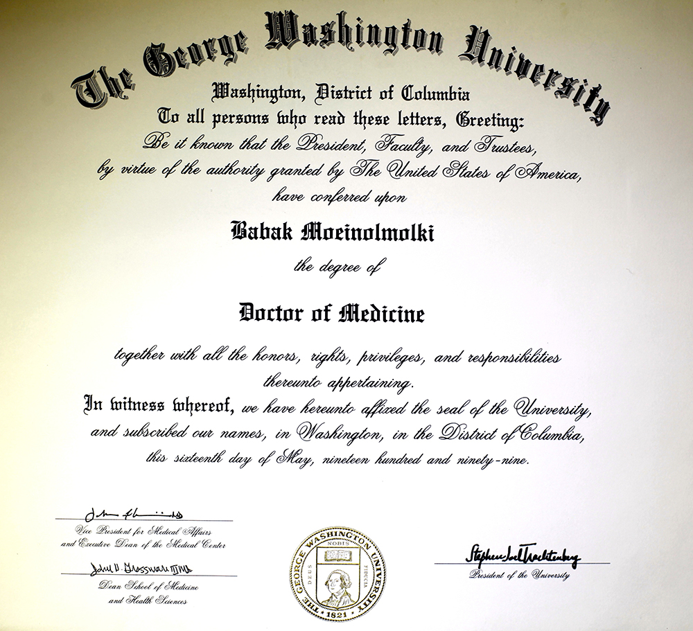 A diploma in cosmetic surgery from George Washington University.